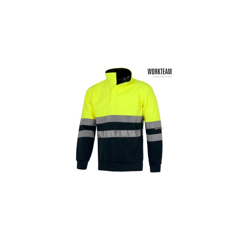 Sudadera combinada 65% poliéster 35% algodón con cintas reflectantes. Parte superior de Alta Visibilidad. Cuello alto con cierre de velcro. Dos cintas reflectantes en pecho, espalda y mangas. Puños y cintura elástica en punto canalé. EN ISO 20471